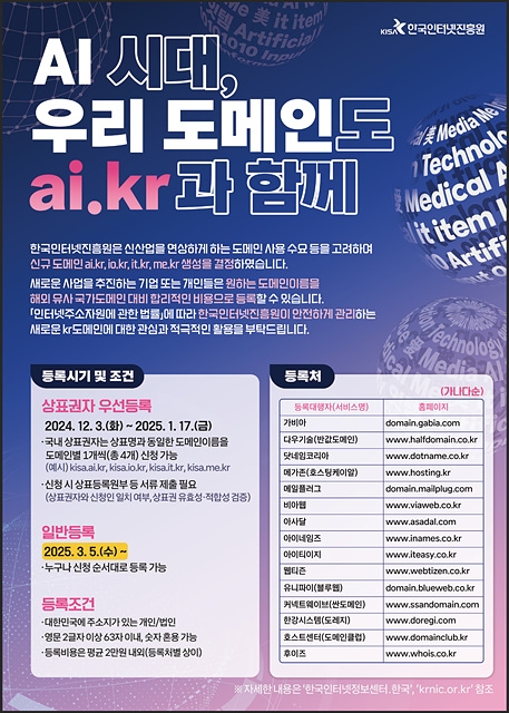 정부가 인공지능(AI) 시대에 발맞춰 22년만에 신설한 'ai.kr' 등의 도메인을 5일부터 일반 등록할 수 있다.