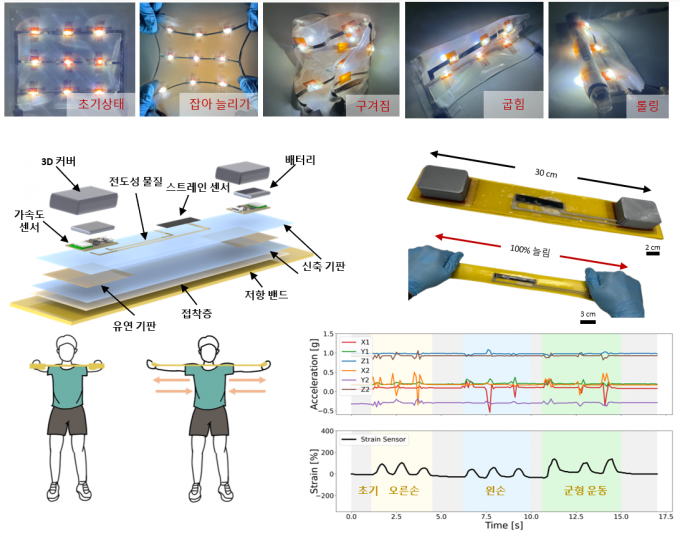 이같은 구현 방식으로 연구팀은 기판을 최대 700%까지 늘릴 수 있는 신축성을 확보했다. 또 1000회가 넘는 물리적 변형 시도에도 안정적인 구조를 지탱할 수 있는 설계를 하는데 성공했다. 이에 따라 늘리거나 비틀림, 압축 등 물리적 변형에도 견딜 수 있는 내구성을 확보했다.