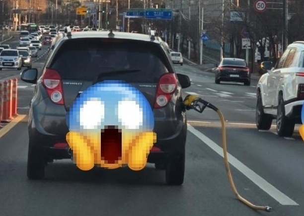 주유건을 꽂은 채 도로를 달리는 차량을 촬영한 영상이 온라인에서 화제다.