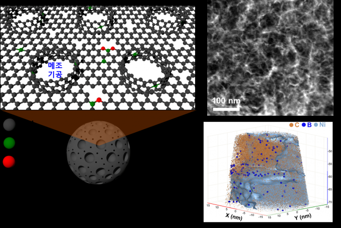 연구팀은 온실가스인 이산화탄소(CO₂), 강력한 환원제인 수소화붕소나트륨(NaBH₄) 그리고 메조 크기의 탄산칼슘(CaCO₃) 입자를 반응시킨 후, 탄산칼슘 입자를 선택적으로 제거하는 방식으로 약 20나노미터(nm) 크기의 메조 기공을 갖는 붕소 도핑 탄소를 합성했다.