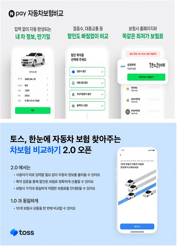 자동차 보험을 더 쉽고 정확하게 비교할 수 있는 '자동차보험 비교·추천 서비스 2.0'이 본격 시행되면서 네이버페이와 토스가 가장 먼저 도입에 나섰다.