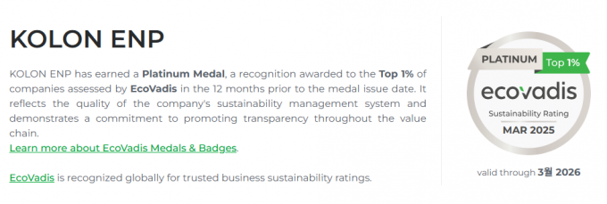 코오롱ENP는 글로벌 ESG 평가기관 에코바디스(EcoVadis)의 평가 최고 등급인 '플래티넘'을 획득했다고 28일 밝혔다.