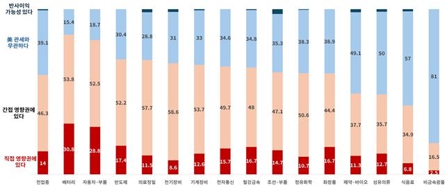 직·간접 영향권에 놓인 품목을 보면 배터리(84.6%)와 자동차·부품(81.3%)이 가장 많았다. 미국에 진출한 우리 대기업에 부품, 소재 등 중간재를 납품하는 협력사들이 많이 포함됐기 때문이다. 또 반도체(69.6%), 의료정밀(69.2%), 전기장비(67.2%), 기계장비(66.3%), 전자·통신(65.4%) 등이 뒤를 이었다.