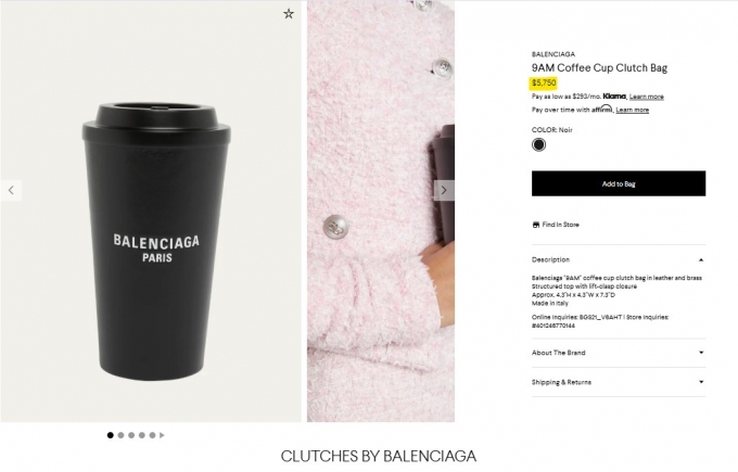 이번 가방은 발렌시아가의 '초현실적' 디자인 핸드백 시리즈 중 하나로 제프 베이조스 아마존 최고경영자(CEO)와 결혼을 앞둔 로렌 산체스가 들고 있는 게 포착되면서 화제가 됐다. 뉴욕포스트는 해당 가방을 두고 "단 한모금도 마실 수 없는 세상에서 가장 비싼 커피 한 잔"이라고 표현했다.