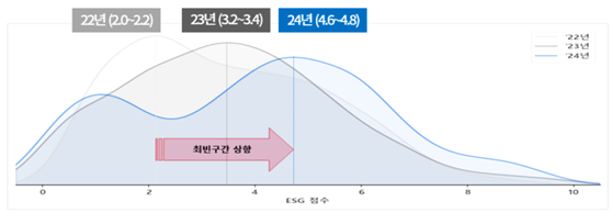 사회부문은 '근로환경' 상승폭이 3.74점(2022년 1.97 → 2024년 5.7)으로 가장 컸다. 워라밸 등 근로환경에 대한 관심도가 높아지면서 기업대응도 이에 비례해 강화된 것으로 해석된다.