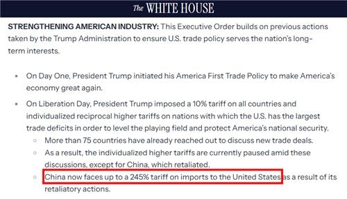 미국 백악관이 홈페이지에 대(對)중 관세율을 알려진 것보다 100%포인트(p) 높은 245%로 표기해 논란이다. 표기 오류인지 추가 관세를 부과한 건지 확인되지 않는 가운데 중국 관영매체에서는 '국제적 농담'이라는 반응을 내놨다.