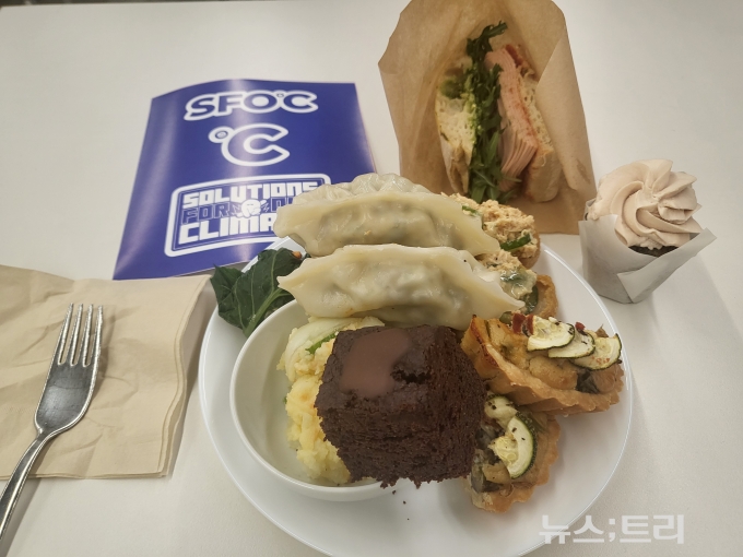 이날 행사에서 제공된 저탄소 식단은 케일쌈밥, 감자샐러드, 유부초밥, 채소키쉬, 만두, 치아바타 샌드위치, 컵케이크와 브라우니 등이었다. 오로지 채식과 식물성 대체육으로 이뤄진 저녁식사였다.