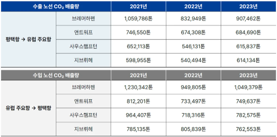 기후솔루션은 23일 발간한 '탄소중립을 위한 대한민국-유럽 녹색해운항로: 국내 자동차 수출입 1위 평택항과 주요 유럽항을 중심으로' 보고서를 통해 국내 최대 자동차 수출입 항만인 평택항과 브레머하펜·앤트워프·지브뤼훼·사우샘프턴 등 유럽 항만들 사이를 녹색해운항로로 구축한다면 이같은 이점이 발생한다고 밝혔다.