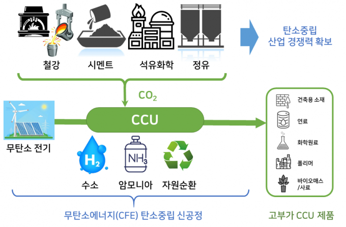이산화탄소 포집·활용(CCU) 분야는 비용을 낮추기 위해 미국·영국 등과 연구개발을 추진한다. 특히 무탄소 에너지를 활용한 지속가능항공유(e-SAF) 생산 연구가 이뤄질 예정이다. 지속가능항공유는 동식물성 기름 등으로 만든 친환경 항공유를 말한다. 이는 석유기반 항공유에 비해 탄소배출량을 최대 80%까지 줄일 수 있다.