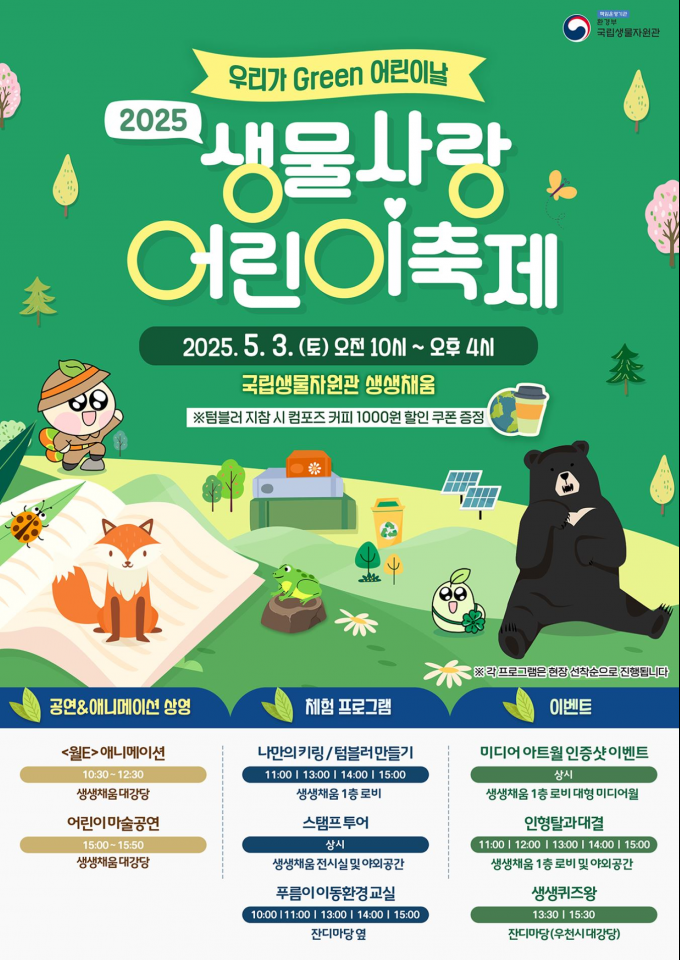 인천 서구 환경부 국립생물자원관은 어린이날과 생물다양성의 달을 맞아 5월 3일 '2025 생물사랑 어린이 축제 우리가 그린(Green) 어린이날' 행사를 개최한다.