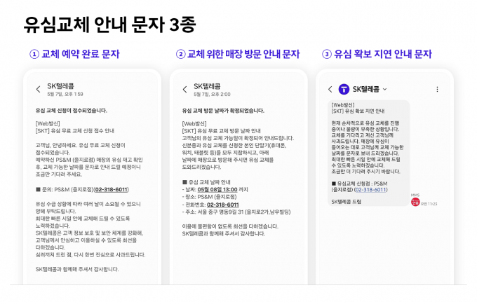 현재 발송중인 유심교체 관련 문자는 '교체 예약 완료 문자', '교체를 위한 매장 방문 안내 문자', '유심 확보 지연 안내 문자' 3종이다.