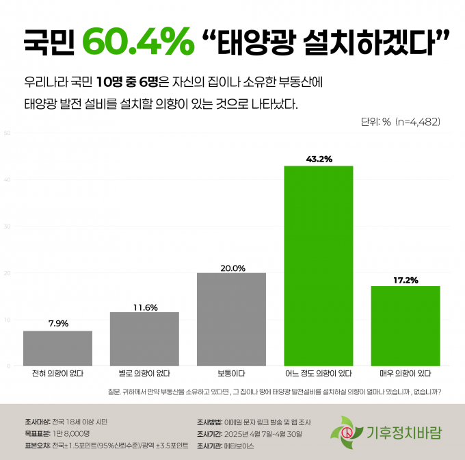 녹색전환연구소·더가능연구소·로컬에너지랩으로 구성된 연대체 '기후정치바람'은 지난 4월 전국 18세 이상 4482명을 대상으로 실시한 설문조사에서 부동산을 소유한 응답자의 60.4%는 태양광 설비를 설치할 의향이 있는 것으로 나타났다.