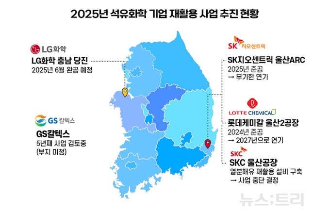반면 LG화학은 예정대로 올 6월에 충남 당진 석문국가산업단지에 2만톤 규모의 폐플라스틱 열분해유 공장과 생분해성 바이오 플라스틱 공장을 완공할 예정이다. 지난 2023년 착공했던 이 공장은 당초 지난해말 완공해 올초부터 가동할 예정이었지만 계획보다 늦어졌다. 다른 석유화학업체와 달리 LG화학이 악조건에도 공장 완공을 추진하는 것은 경영진이 재활용 등 친환경사업이 개화될 것으로 확신하기 때문으로 보인다. 지난 3월 신학철 LG화학 부회장은 "2025년 상반기 내 공장을 완공하겠다"고 밝힌 바 있다.
