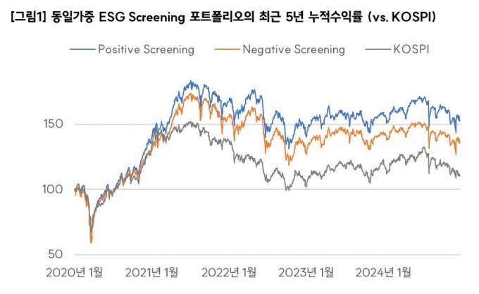 이 보고서는 ESG 등급이 높은 기업만 골라 투자하는 '포지티브 스크리닝 전략'과 ESG 등급이 낮은 기업을 빼고 투자하는 '네가티브 스크리닝(Negative Screening) 전략'을 각각 만들어 수익률과 리스크를 비교한 것이다.