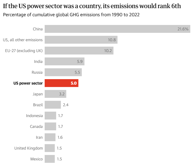 미국은 최근 몇 년 사이에 석탄발전의 시장축소 등으로 발전부문 온실가스 배출량이 줄기는 했지만, 여전히 기후위기의 핵심 원인으로 꼽히고 있다. 보고서에 따르면, 미국 내 발전소가 2022년 한해동안 배출한 오염물질로 인해 장기적으로 5300명이 조기 사망할 가능성이 제기됐을 정도다. 이로 인한 기후피해는 전세계적으로 2250억달러의 건강 피해와 750억달러의 노동생산성 손실에 이를 것으로 추정됐다.