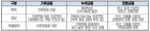 전환금융은 철강, 화학, 에너지 등 탄소배출이 많은 산업이 탄소 감축에 나설 수 있도록 연계해 지원하는 금융을 말한다. 즉, 저탄소로의 전환을 돕는 자금이다.