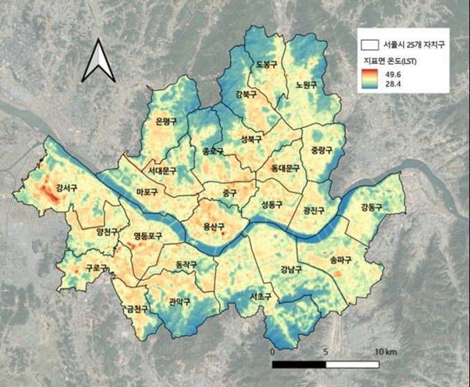 산림청 국립산림과학원은 위성사진을 기반으로 서울시 자치구별 평균 지표 온도를 비교해보니 도시숲 면적이 62.3%로 가장 높은 강북구의 평균 기온은 지난해 8월 29일 기준 34.9℃인 반면, 도시숲 면적 5.8%로 가장 낮은 영등포구의 기온은 37.9℃로 나왔다고 11일 밝혔다.