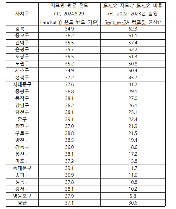 도시숲 면적이 50%를 넘는 7개 지역의 지표면 평균 온도는 35.41℃였다. 반면 도시숲 면적이 30% 미만인 17개 서울 자치구의 평균 온도는 37.4℃였다. 도시숲 면적이 12% 미만인 하위 5개 자치구의 경우 평균 37.9℃를 보였다.