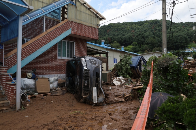 산사태 피해까지 겹쳤다. 산사태로 쓸려온 흙에 집이 무너지면서 70대 여성이 숨진 신상리 일대도 아수라장이었다. 사고 지점은 주택 3채는 들이 형체를 알 수 없을 정도로 허물어졌고 흙더미 속 파묻힌 냄비 등이 주민이 살고 있었다는 것을 알게 했다. 5∼10m 떠밀려온 승용차와 트럭은 다른 집 마당에 고꾸라지거나 옆으로 누웠다.