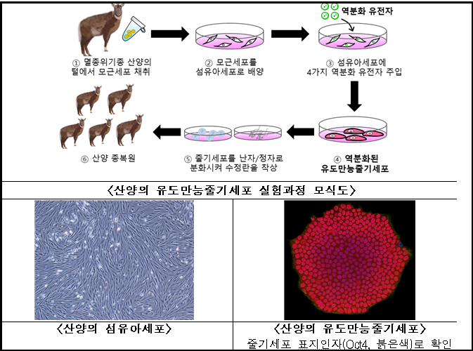 환경부 소속 국립생물자원관은 '산양' 모근에서 채취한 체세포를 초기 줄기세포 상태인 유도만능줄기세포(iPSC)로 되돌리는데 국내 최초로 성공했다고 30일 밝혔다. iPSC(induced Pluripotent Stem Cell)는 특정조직으로 자란 세포를 다양한 세포로 자라날 수 있도록 되돌린 줄기세포를 말한다.