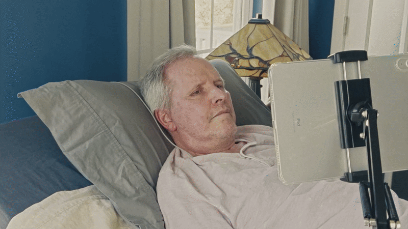 4일(현지시간) 애플이 공개한 영상에는 침대에 누워있는 전신마비 루게릭병 환자가 거치대에 놓인 아이패드를 가만히 응시하고 있는데도 앱이 실행되거나 텍스트가 작성되는 모습이 담겨있다.