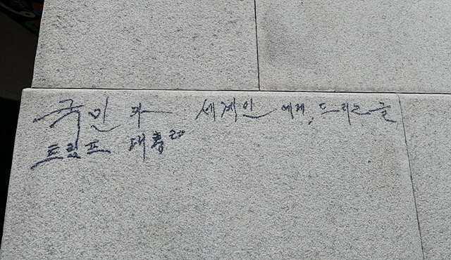 김씨는 광화문에 있는 3개의 홍예문 가운데 좌측과 중앙 사이에 있는 무사석(武沙石·홍예석 옆에 층층이 쌓는 네모반듯한 돌)에 검은 매직으로 '국민과 세계인에 드리는 글'이라고 쓴 뒤 그 아래에 '트럼프 대통령'이라고 쓰던 중 적발됐다. 글자가 적힌 범위는 가로 약 1.7m, 세로 0.3m에 달한다.