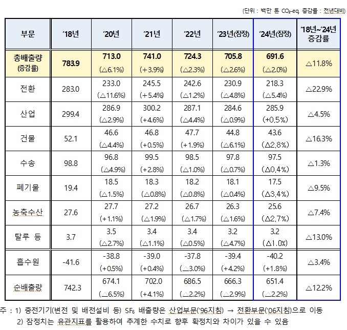 환경부 온실가스종합정보센터는 파리기후변화협정에 따른 새로운 2006 기후변화에 관한 정부간 협의체 산정지침(2006 IPCC)과 '2030 국가온실가스감축목표(NDC)' 이행점검을 위한 1996 IPCC 지침을 적용해 산정한 결과, 2024년 국가온실가스 잠정배출량이 전년보다 2%포인트 감소한 6억9158만톤으로 산출됐다고 20일 밝혔다. 지난해 국가온실가스 잠정배출량은 7억577만톤이었다.