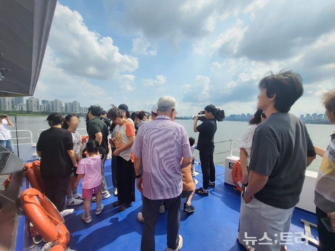 ▲한강버스 갑판에서 한강 운치를 감상하는 승객들 ©newstree