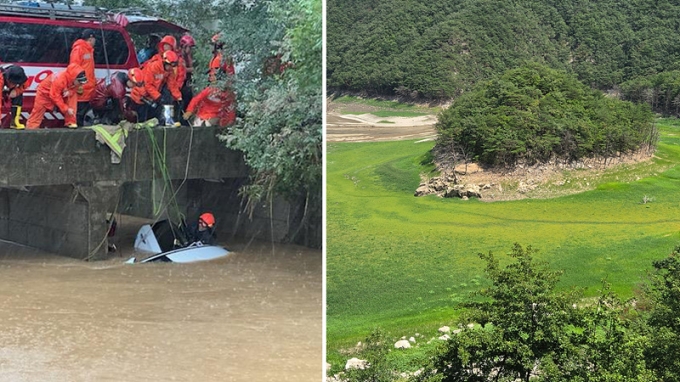 ▲폭우가 내린 경기 김포(왼쪽)와 가뭄으로 풀이 자란 강릉 오봉저수지의 모습 (사진=연합뉴스)
