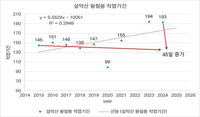 설악산국립공원에서는 신갈나무의 잎이 나무에 매달린 착엽 기간이 최근 10년(2015~2024년)동안 평균 152일로 나타났다. 2024년의 착엽 기간은 2015년에 비해 약 48일 길어진 것으로 확인됐다.