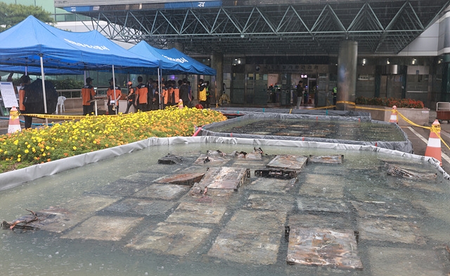 ▲국가정보자원관리원 화재로 불에 탄 리튬이온 배터리를 소화수조에 담아놓은 모습(사진=연합뉴스)