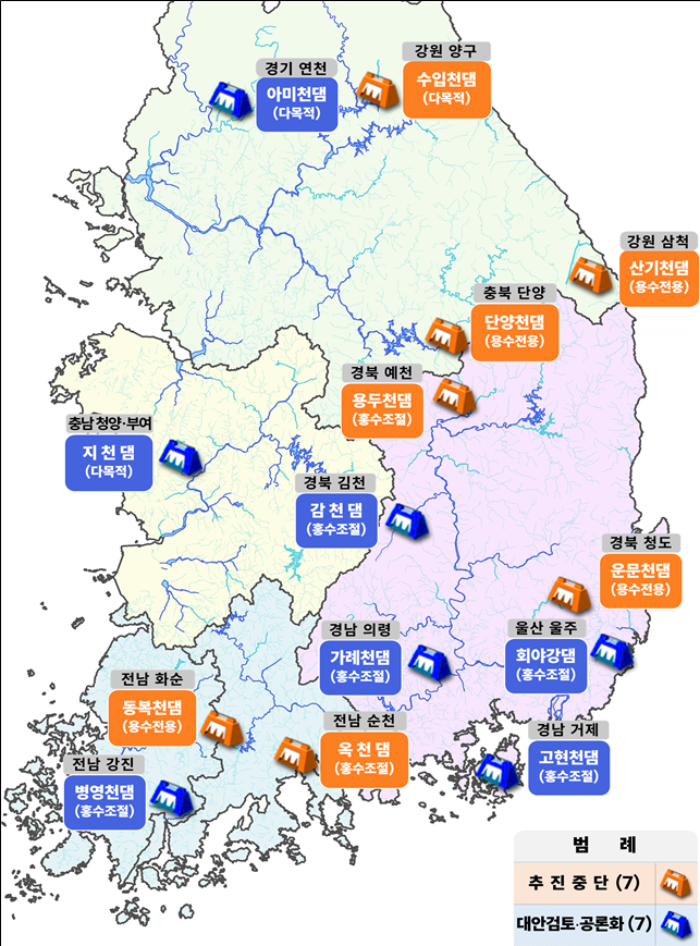 중단된 7개 댐은 양구 수입천댐, 단양 단양천댐, 순천 옥천댐, 화순 동복천댐, 삼척 산기천댐, 청도 운문천댐, 예천 용두천댐이다. 이들 댐은 필요성이 낮고 지역 주민의 반대가 심해 건설 추진을 중단한다는 방침이다.