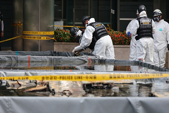 ▲국가정보자원관리원 화재현장에서 리튬이온 배터리 상태를 살피는 감식반 (사진=연합뉴스)