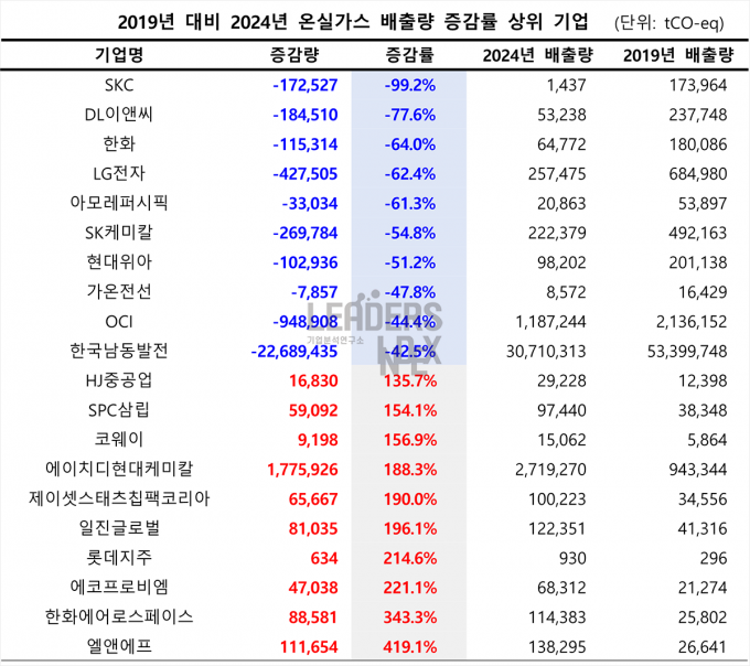 가장 큰 감소율을 보인 기업은 SKC로 2019년 17만3964t에서 2024년 1437t으로 99.2% 감축에 성공했다. 이는 온실가스 배출량의 대부분을 차지했던 온산공장을 매각한 영향으로 분석된다. 이어 DL이앤씨가 77.6%, 한화 64.0%, LG전자 62.4%, 아모레퍼시픽 61.3%, LG전자 54.8% 순으로 감축율이 높았다.