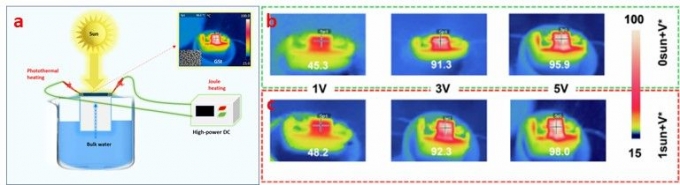 이에 연구팀은 저전압의 전기가 흐를 때 발생하는 열을 이용하는 '줄(Joule) 가열' 방식을 결합해 시간·날씨에 의한 영향을 줄임과 동시에 효율적으로 증발량을 늘리는 기술을 개발했다. 이를 이용하면 낮에는 태양열, 밤에는 전기열을 이용해 하루종일 안정적으로 담수를 생산할 수 있다.