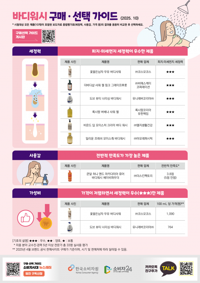 한국소비자원이 시중에 판매되는 바디워시 10개 제품에 대해 평가해본 결과, 피지 세정력은 모든 제품이 우수했지만 일부 제품은 알레르기 유발성분을 표시하지 않았다고 14일 밝혔다.
