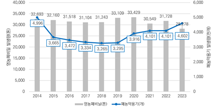 2023년 기준 경기도 영농폐기물 발생량은 영농 폐비닐이 약 3만톤(93%), 폐농약 용기가 약 460만개(94%)로 나타났다.