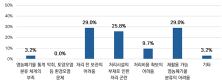 경기연구원이 지난 7월 16일부터 15일간 경기도 31개 시군 영농폐기물 관련 담당 공무원 31명을 대상으로 실시한 설문조사에 따르면 영농폐기물 관리 시 발생하는 문제점으로 '처리 전 보관의 어려움'과 '재활용 가능 영농폐기물 분류의 어려움'을 각각 29%로 꼽았다. 또 '처리시설 부재로 인한 처리 곤란'이 25.8%로 뒤를 이었다.