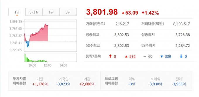 코스피는 20일 오전 11시 40분 전장 대비 52.17포인트(1.39%) 오른 3801.06을 기록하며 사상 최초로 3800선을 넘어 3802.53까지 치솟았다. 이날 지수는 전장보다 26.51포인트 오른 3775.40으로 시작했으나 장 초반 오름폭이 둔화되더니 하락세로 돌아서 한때 3728.38까지 물러섰다. 하지만 다시 상승세로 전환하며 장중 사상 최고가를 기록했다.
