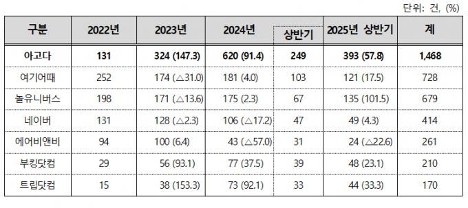 한국소비자원은 지난 2022년~2025년 6월까지 접수된 숙박 관련 피해구제 신청건수는 6252건으로, 이 가운데 7개 숙박플랫폼에 대한 피해구제 신청건수가 3881건으로 전체의 62.1%를 차지했다고 29일 밝혔다. 최근 3년간 150건 이상 피해구제 접수된 상위 7개 숙박플랫폼은 아고다, 여기어때, 놀유니버스, 네이버, 에어비앤비, 부킹닷컴, 트립닷컴이다.