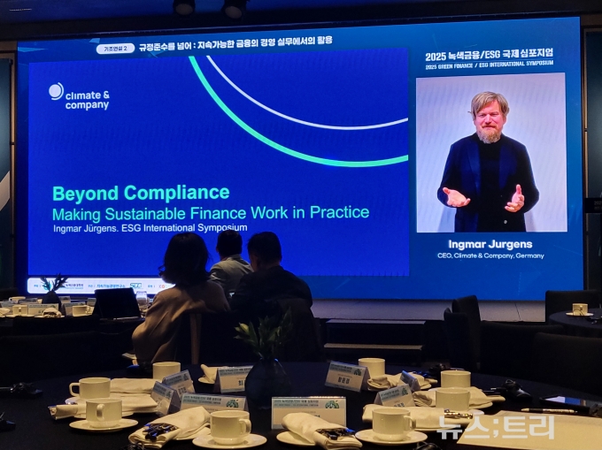 ▲6일 서울 강남구 웨스틴서울 파르나스에서 열린 '2025 녹색금융/ESG 국제 심포지엄'에서 잉마르 위르겐스 CEO가 기조연설을 하고 있다. ©newstree
