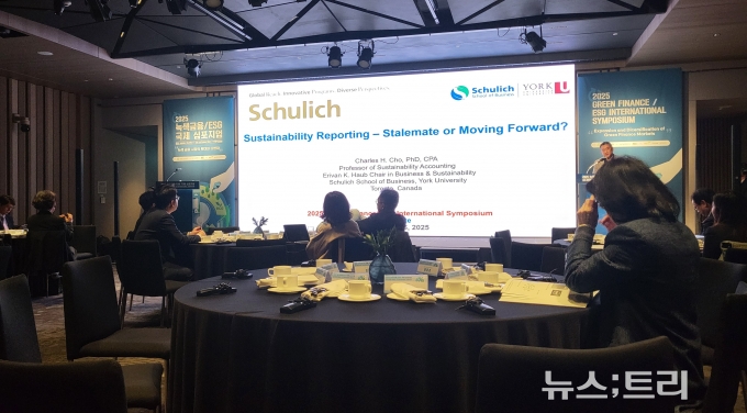 ▲6일 서울 강남구 웨스틴서울 파르나스에서 열린 '2025 녹색금융/ESG 국제 심포지엄'에서 찰스 조 교수가 기조연설을 하고 있다. ©newstree