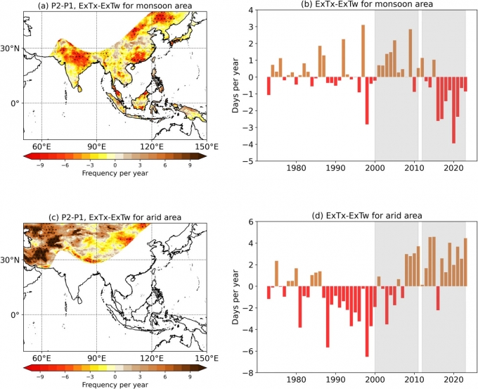 연구팀은 유럽중기예보센터(ECMWF)의 고해상도 대기 재분석 자료(ERA5)를 활용해 1973부터 2023년까지 약 50년간의 아시아 여름 기후데이터를 정밀 검토했다. 기존 연구가 아시아 전체를 하나의 기후권으로 구분한 데 비해, 이번 연구는 몬순지역과 건조지역을 구분해 폭염의 유형별 변화 추세를 정량적으로 규명했다. 또한 '일 최고기온'뿐 아니라 기온과 습도를 함께 고려한 습구온도를 통해 인체가 실제로 느끼는 열 스트레스 변화를 함께 분석했다.