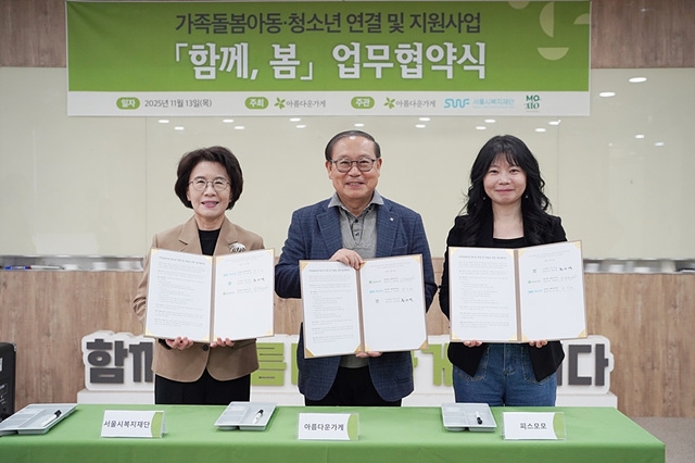 재단법인 아름다운가게가 재단법인 서울시복지재단, 사단법인 피스모모와 함께 13일 협약식을 갖고 '가족돌봄아동·청소년 연결 및 지원사업-함께, 봄' 사업을 시작했다고 밝혔다.