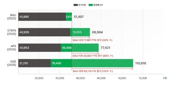보고서에 따르면 국제에너지기구(IEA)의 1.5℃ 시나리오(NZE)를 적용했을 때, 공적 금융기관이 2035년까지 청정에너지 중심으로 포트폴리오를 전환하게 되면 국내 일자리는 약 2배 가까이 증가하는 것으로 나왔다. 현재 수준의 금융 지원을 유지할 경우(BAU, Business as Usual 시나리오) 국내 일자리는 5.1만개(Full-Time Equivalent, FTE: 1년동안 정규직으로 근무하는 직원 수를 기준으로 한 고용단위) 수준에 머무르지만, 금융지원 규모를 확대하고 청정에너지 비중을 높일 경우(NZE 시나리오) 취업유발 인원은 약 11만명으로 증가해 115% 성장한다는 것이다.