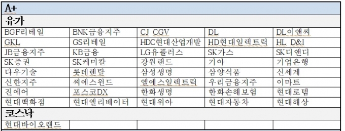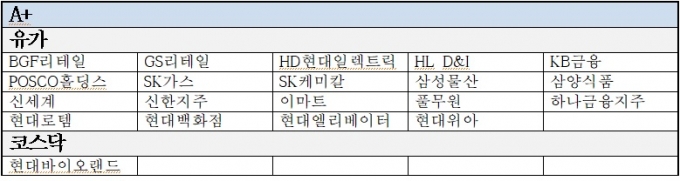 부문별로 살펴보면, 환경 부문에서 A+ 등급을 받은 기업은 BGF리테일, LG유플러스, 현대백화점, GS리테일, KB금융, SK케미칼, 진에어 등 41곳이고, 사회등급에서 A+를 받은 기업은 209곳이다. 또 지배구조에서 A+ 등급을 받은 기업은 KB금융과 포스코홀딩스, SK이노베이션, 삼성물산, 신한지주, 풀무원, 하나금융지주 등 7곳이다.
