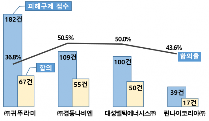 피해구제 신청 중 환급·수리 등으로 보상받은 비율(합의율)도 귀뚜라미가 36.8%로 가장 낮았다. 전체 합의율도 42.3%(247건)으로 절반이 되지 않았다. 그나마 경동나비엔의 합의율이 50.5%로 상대적으로 높았다.