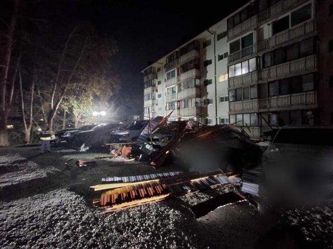 1일 강원특별자치도소방본부에 따르면 이날 오전 2시 53분경 속초시 교동 한 아파트 주차장에서 지붕 구조물이 강풍에 떨어졌다. 이 구조물이 그대로 차량에 날아들어 차량 6대가 부서졌다.