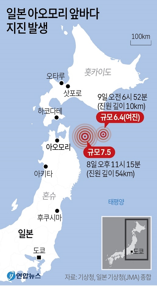 9일 아사히신문 등 현지매체에 따르면 8일 밤 11시 15분쯤 일본 혼슈 동북부지역인 아오모리현 앞바다에서 규모 7.5 지진이 발생한데 이어 규모 6.4에 이르는 여진까지 발생하면서 부상자가 30명이 넘게 발생했다.