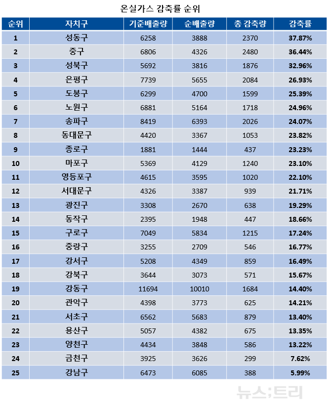 25개 서울 자치구에서 감축률 1위는 지난 한해동안 온실가스를 37.87% 줄인 '성동구'가 차지했다. 중구(36.44%)와 성북구(32.96%), 은평구(26.93%), 도봉구(25.39%)가 그 뒤를 이었다. 노원구(24.96%), 송파구(24.07%), 동대문구(23.82%), 종로구(23.23%), 마포구(23.10%)까지 포함하면 상위 10개 자치구는 모두 20% 이상의 감축률을 기록했다. 이들 자치구는 청사 에너지 효율 개선, 고효율 조명과 냉난방 설비 교체, 태양광 설치 등 비교적 시설기반 감축이 가능한 영역에서 성과를 낸 곳들이다.